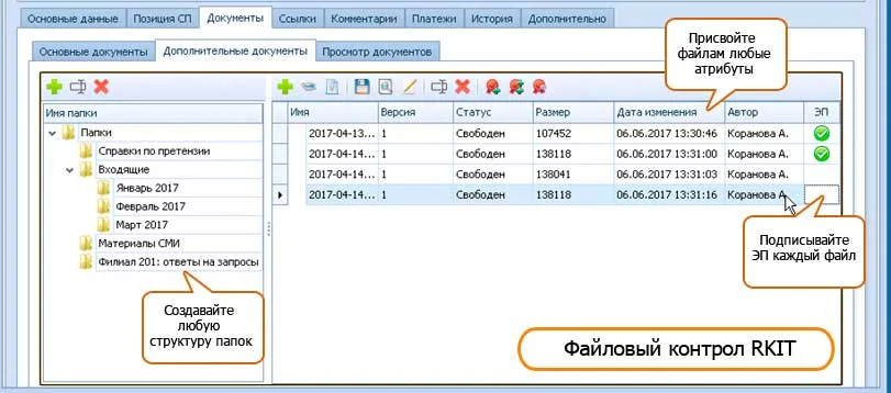 - Подписать цифровой подписью можно каждый файл в отдельности. В стандартном Docsvision можно подписать всю карточку, отдельный файл подписать нельзя. Электронная подпись в Файловом контроле RKIT реализована в полном объеме усиленной квалифицированной подписи по ФЗ 63.