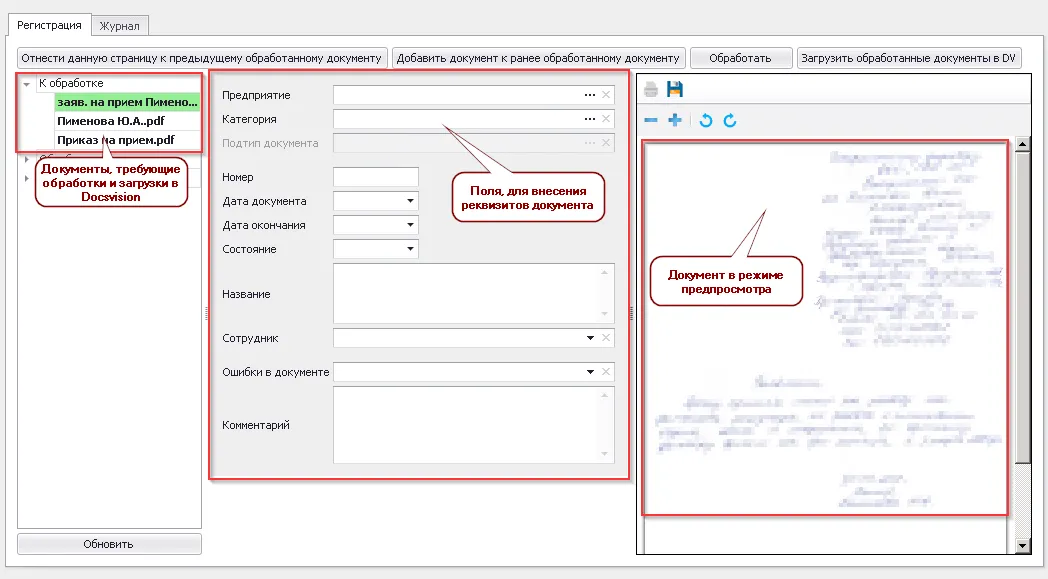 При помощи утилиты потоковой регистрации сотрудник кадровой службы загружает отсканированные документы в систему.