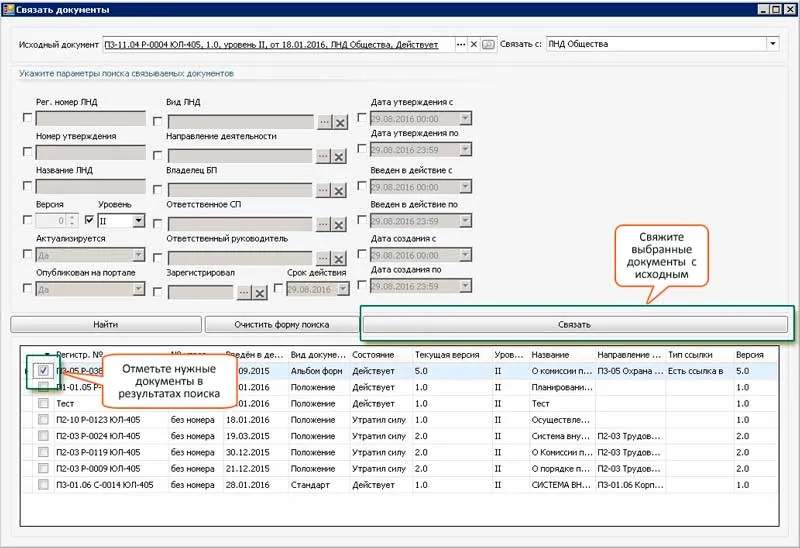 Настроить вывод атрибутов из связываемых видов документов, которые будут отображаться в форме связывания (например, для быстрого поиска локальных нормативных документов, выведены поля: «рег.номер», «вид», «версия», «уровень» и т.д.). Для каждого вида документов можно настроить свои атрибуты.