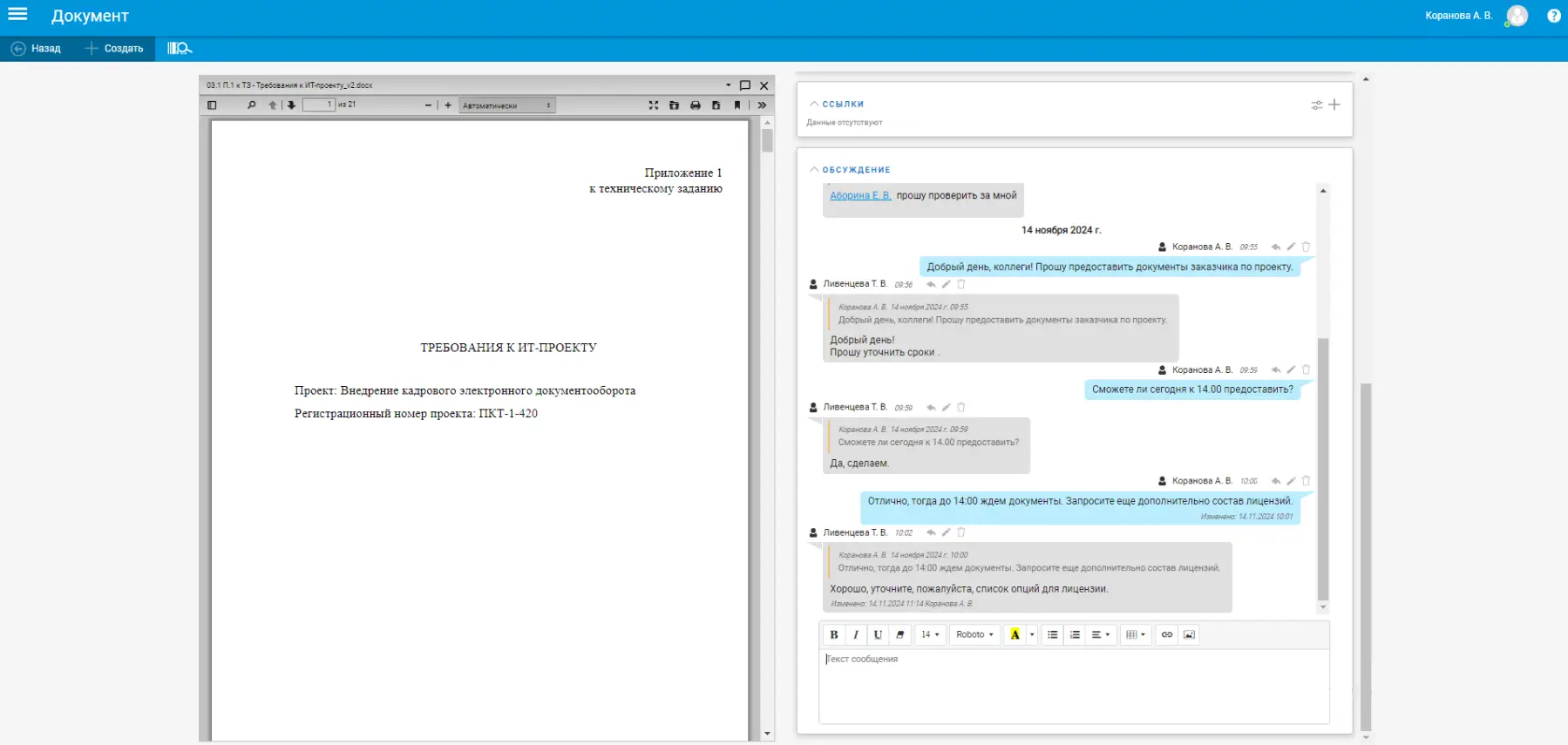 Сотрудник не пропустит сообщение в чате, так как система показывает всплывающие уведомления при каждом новом сообщении. Переписка с коллегами в режиме реального времени в чате по задаче.