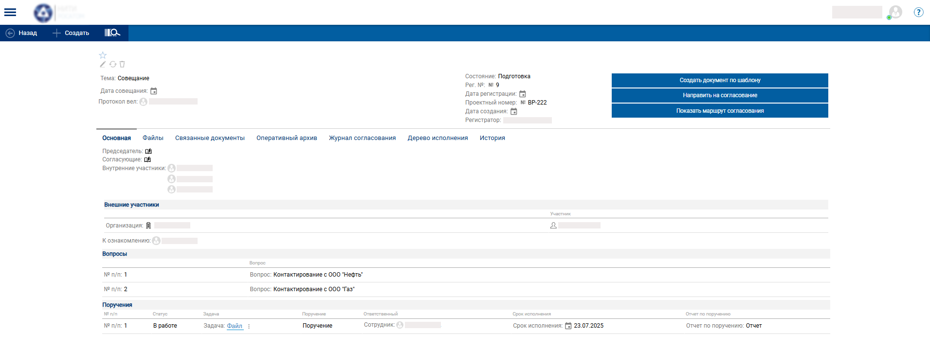 Определите тему совещания, рассматриваемые вопросы и докладчиков. Предварительно согласуйте повестку, через систему вышлите материалы всем участникам. Система позволяет пригласить участников из других компаний. Можно сохранить мероприятие как шаблон.